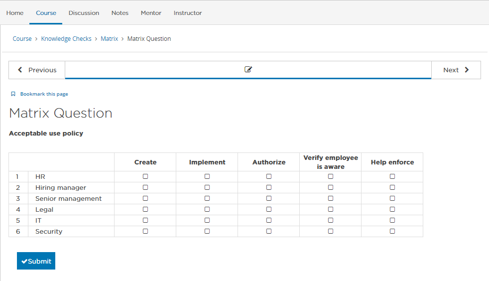 The matrix activity is a new activity type that was built to accomodate a table that the student would fill out. This is similar to matching, but is built in a more structured way so that students choose multiple columns that match with each row.