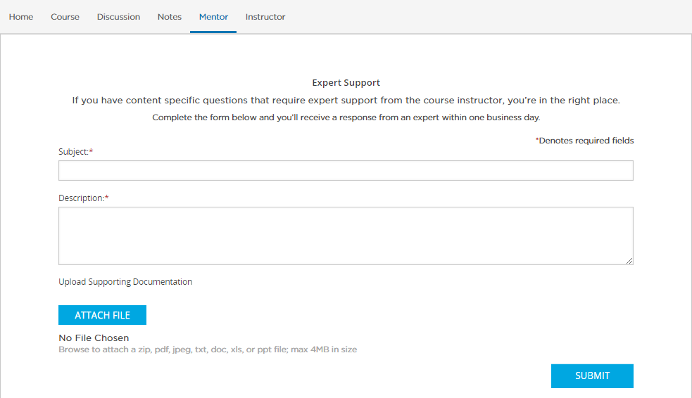 A major component missing from an OnDemand course, compared to an Instructo-led course is the Instructor. Adding in a Mentoring feature to the courseware allows for students to still interact with an expert in an OnDemand course. This happens either through 24/7 chat support, or through email directly to the Subject Matter Expert.